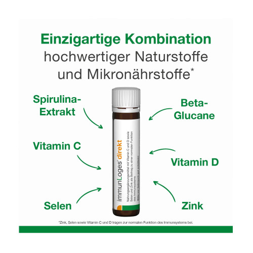 Ob bei der Arbeit, unterwegs oder zuhause: Die praktischen immunLoges® direkt Trinkampullen unterstützen die Abwehrkräfte mit einer durchdachten Zusammensetzung. Eine Trinkampulle pro Tag reicht aus, um den Körper mit sorgfältig ausgewählten Natur- und Mikronährstoffen zu versorgen. Dank des fruchtigen Geschmacks lassen sich die Trinkfläschchen angenehm in den Alltag integrieren – ohne zusätzliche Tabletten oder Kapseln.