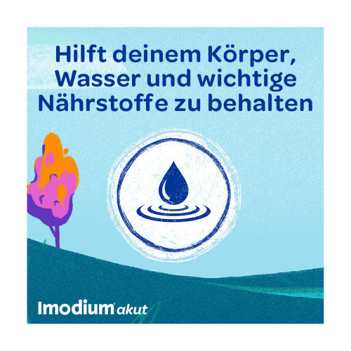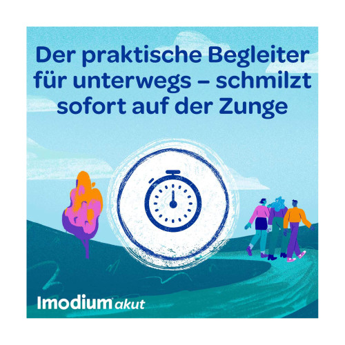 Imodium® akut lingual. Wirkstoff: Loperamidhydrochlorid. Anwendungsgebiet: Symptomatische Behandlung von akuten Durchfällen für Erwachsene und Jugendliche ab 12 Jahren, sofern keine ursächliche Therapie zur Verfügung steht. Eine über 2 Tage hinausgehende Behandlung nur unter ärztlicher Verordnung und Verlaufsbeobachtung. Warnhinweise: Enthält Aspartam, Pfefferminz-Aroma (Benzylalkohol, Levomenthol, Glukose und Spuren von Sulfiten).