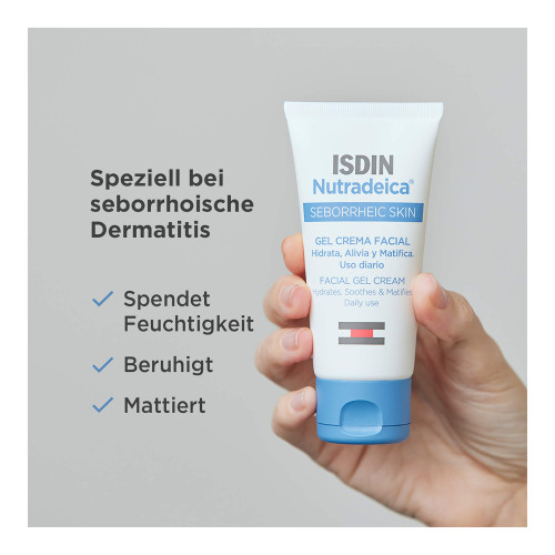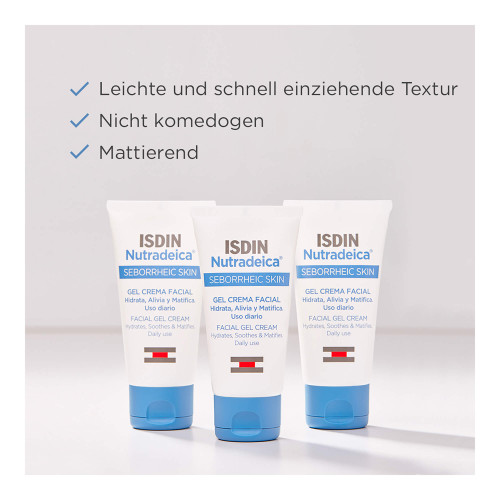 Seborrhoische Haut kann sich sowohl im Gesicht als auch auf der Kopfhaut auftreten und unangenehme Schuppenbildung, Rötungen und Juckreiz verursachen. Die Nutradeica® Gel-Creme hilft, die Anzeichen von seborrhoischer Haut zu reduzieren.