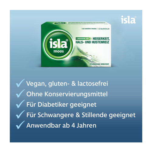Die Inhaltsstoffe von isla® moos legen sich wie Balsam über die Schleimhaut in Hals und Rachen. So wird die gereizte Schleimhaut vor weiteren Angriffen geschützt und kann sich durch die wohltuende Wirkung schneller erholen, insbesondere bei Beschwerden im Hals durch