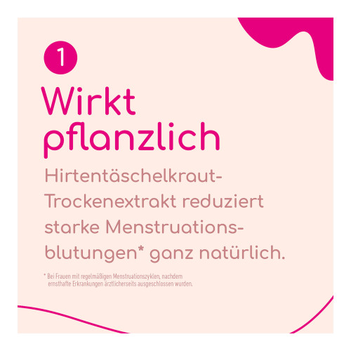 KadeZyklus bei starken Blutungen während der Menstruation 400 mg Filmtabletten. Wirkstoff: Hirtentäschelkraut-Trockenextrakt. Anwendungsgebiete: Traditionelles pflanzliches Arzneimittel zur Verminderung starker Menstruationsblutungen bei Frauen mit regelmäßigen Menstruationszyklen, nachdem ernsthafte Erkrankungen ärztlicherseits ausgeschlossen wurden, ausschließlich aufgrund langjähriger Anwendung für das Anwendungsgebiet registriert. Warnhinweis: Enthält Lactose.