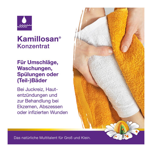 Kamillosan Konzentrat, Flüssigkeit. Anwendungsgebiete: Zur Inhalation bei entzündlichen Erkrankungen und Reizzuständen der Atemwege; als Zusatz für feuchte Umschläge, Spülungen oder Waschungen bei entzündlichen Haut- und Schleimhauterkrankungen einschließlich der Mundhöhle und des Zahnfleisches; als Zusatz zu Teil-und Sitzbädern oder Spülungen bei Entzündungen im Analbereich und im Bereich der Geschlechtsorgane; zum Einnehmen bei krampfartigen und entzündlichen Erkrankungen im Magen-Darm-Bereich. Warnhinweise: Enthält 42,8 Vol.-% Alkohol, Macrogolglycerolhydroxystearat und 1 mmol Natrium.