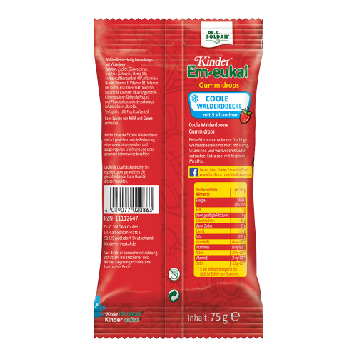 Intensiv-fruchtig und unverwechselbar gut: Die Kinder Em-eukal Gummidrops gibt es jetzt auch mit Walderdbeer-Geschmack. Die Kombination mit mildem Honig überzeugt genauso wie die extra frische Mentholzucker-Kandierung. Hergestellt auf Basis der einzigartigen Geheimrezeptur und in bewährter Premiumqualität.