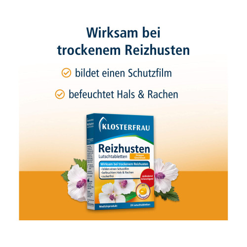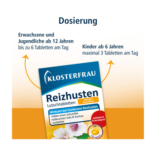 Klosterfrau Reizhusten Lutschtabletten sorgen mit ihrem natürlichen Heilpflanzenkomplex auf Eibsich-Basis für eine wirksame Befeuchtung und den Schutz des Hals- und Rachenraumes. Durch die Schutzschicht auf den gereizten Schleimhäuten wird der Hustenreiz effektiv gelindert und die Atemwege werden beruhigt. Der fruchtig-leckere Orangengeschmack ist besonders angenehm.