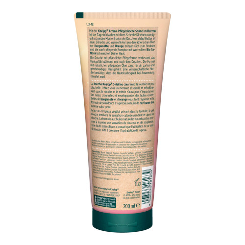 Mit der Kneipp Aroma-Pflegedusche Sonne im Herzen ist der Tag ein bisschen schöner. Schenke Dir einen sonnigerfrischenden Moment unter der Dusche und das Wetter ist egal. Zitrische und warme Noten aus den ätherischen Ölen der Bergamotte und Orange bringen Dich zum Strahlen und die sanft pflegende Rezeptur mit wertvollem Bio Safloröl schmeichelt Deiner Haut.