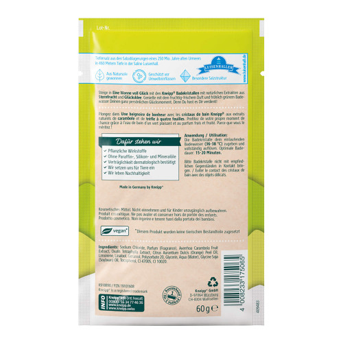 Steige in Eine Wanne voll Glück mit den Kneipp® Badekristallen mit natürlichen Extrakten aus Sternfrucht und Glücksklee. Genieße mit dem fruchtig-frischem Duft und fröhlich grünem Badewasser Deinen ganz persönlichen Glücksmoment. Denn Du hast es Dir verdient!