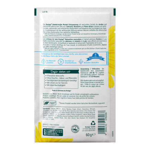 Die Kneipp® Badekristalle Muskel Entspannung mit wertvollem Extrakt der Arnika und natürlichen ätherischen Ölen aus Cabreuva, Rosmarin und Pinus-Arten schenken ein wohltuendes, wärmendes und entlastendes Badeerlebnis und bewahren die Feuchtigkeit der Haut.