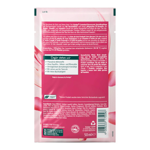 Ein Geschenk für Dich und Deine Haut: Das Kneipp® Cremebad Rosenzarte Verwöhnpflege mit hochwertigem Extrakt aus Bio Rosenblüten und einem pflegenden Öl-Komplex aus Argan-, Mandel- und Jojobaöl schenkt ein glattes Hautgefühl und pflegt die Haut. Der blumige, zart rosige Duft und langanhaltender cremiger Schaum sorgen für ein entspannendes Wohlfühlerlebnis, während das Bad die Haut vor dem Austrocknen bewahrt.