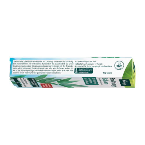 Kneipp Erkältungs Balsam. Wirkstoff: Eucalyptusöl. Anwendungsgebiete: Creme zur Anwendung bei Erwachsenen, Jugendlichen und Kindern ab 3 Jahren. Traditionelles pflanzliches Arzneimittel zur Linderung von Husten bei Erkältung, ausschließlich aufgrund langjähriger Anwendung. Warnhinweise: Enthält Cetylstearylalkohol/Cetylalkohol und Menthol/Levomenthol. Dieses Arzneimittel enthält 0,1 g Alkohol (Ethanol) pro 5 cm Cremestrang entsprechend 7,5 g/100 g (7,5 %).