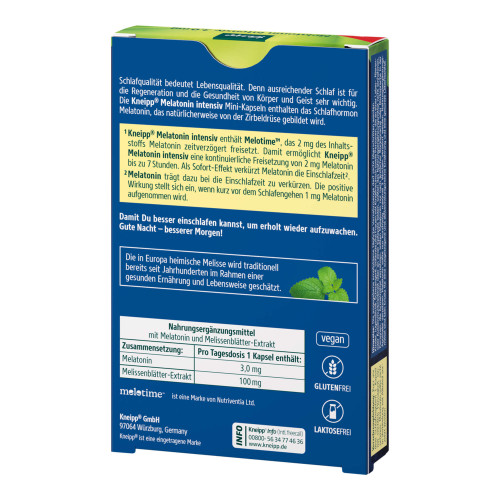 1 Kneipp Melatonin intensiv enthält Melotime™, das 2 mg des Inhaltsstoffs Melatonin zeitverzögert freisetzt. Damit ermöglicht Kneipp Melatonin intensiv eine kontinuierliche Freisetzung von 2 mg Melatonin bis zu 7 Stunden. Als Sofort-Effekt verkürzt 1 mg Melatonin, welches sofort freigesetzt wird, die Einschlafzeit.