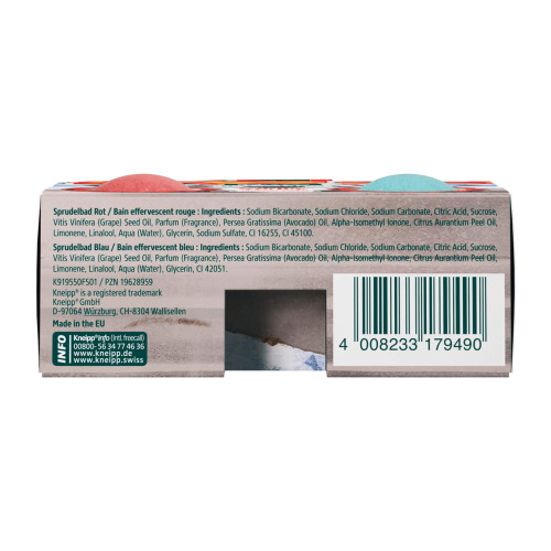 Sprudelbad Rot: Sodium Bicarbonate, Sodium Chloride, Sodium Carbonate, Citric Acid, Sucrose, Vitis Vinifera (Grape) Seed Oil, Parfum (Fragrance), Persea Gratissima (Avocado) Oil, Alpha-Isomethyl Ionone, Citrus Aurantium Peel Oil, Limonene, Linalool, Aqua (Water), Glycerin, Sodium Sulfate, CI 16255, CI 45100.