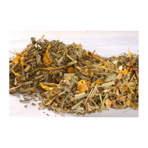 Zitronengras*, Pfefferminze* (30 %), Apfelstücke*, Kamillenblüten*, Erdbeerblätter*, Fenchel*, Lindenblüten*, Ringelblumenblüten*.