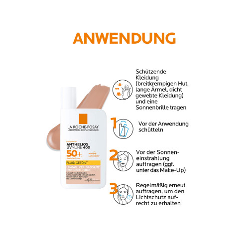Das Anthelios Invisible Fluid Getönt UVMune 400 LSF 50+ von La Roche Posay mindestens eine halbe Stunde vor dem Sonnenbaden und nach der täglichen Hautpflegeroutine großzügig auf das Gesicht auftragen, sorgfältig verteilen und gut einziehen lassen. Anschließend regelmäßig den Sonnenschutz auffrischen, insbesondere nach längerem Schwitzen, Schwimmen oder Abtrocknen. Bei direktem Augenkontakt sofort und gründlich ausspülen. Kontakt mit Textilien vermeiden. Als ergänzende Sonnencreme für den Körper empfiehlt es sich das Anthelios Invisible Spray LSF 50+ bei empfindlicher und zu Sonnenallergie neigender Haut zu nehmen.