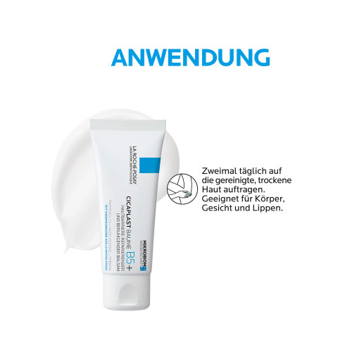 La Roche Posay Cicaplast Baume B5+ für geschädigte und irritierte Haut kann bei verschiedenen Hautreizungen angewendet werden. Dabei eignet sich die reparierende Salbe für gereizte Haut am Körper, im Gesicht und an den Lippen bei Erwachsenen, Kindern und Babys. Vor der Verwendung sollte die Haut gereinigt werden und trocken sein. Anschließend kann die Wundsalbe auf die entsprechende Hautstelle aufgetragen, sanft verteilt und leicht einmassiert werden.