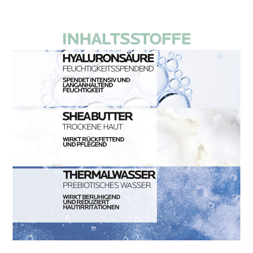 Mit Hyaluronsäure natürlichen Ursprungs, Sheabutter und Thermalwasser aus La Roche Posay wird die Haut intensiv mit Feuchtigkeit versorgt, aufgepolstert und geschmeidig gepflegt. Die reichhaltige Gesichtspflege wirkt Trockenheit entgegen und schenkt der Haut mehr Ausstrahlung. Die Haut bleibt bis zu 72 Stunden mit Feuchtigkeit versorgt und fühlt sich zart an.