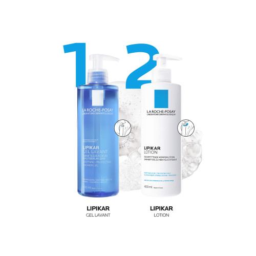 Eine haselnussgroße Menge LIPIKAR Gel Lavant auf die Handfläche geben. Auf die zuvor angefeuchtete Haut auftragen, sanft einmassieren. Abspülen.