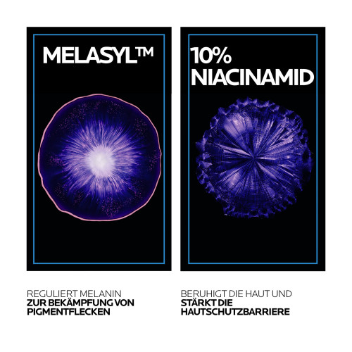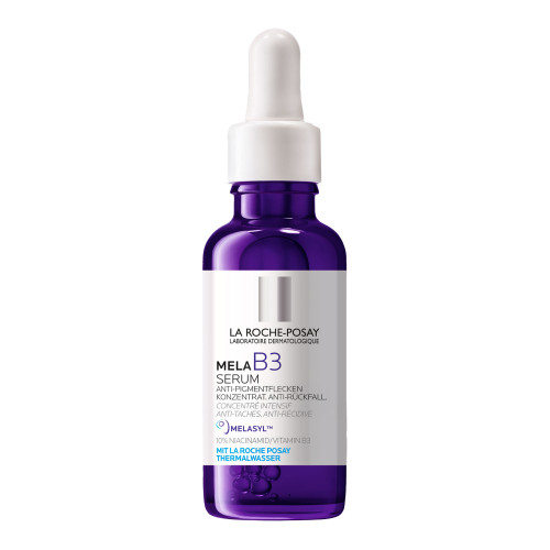 Das Anti-Pigmentflecken-Serum MELA B3 von La Roche Posay fängt überschüssiges Melanin ab, bevor dunkle Flecken auf der Haut überhaupt entstehen können. Dabei bewahrt und optimiert das patentierte Melasyl jeden natürlichen Hautton. Dank der multifunktionalen Formel des Gesichtsserums werden Pigmentflecken mit allen Hebeln bekämpft: Während Melasyl das Melanin reguliert und Niacinamid die Haut beruhigt, sorgt LHA für die Hauterneuerung. Hyaluron und Glycerin versorgen die Haut zusätzlich mit intensiver Feuchtigkeit. So ist bereits nach 4 Wochen eine erste Milderung von Pigmentflecken sichtbar.