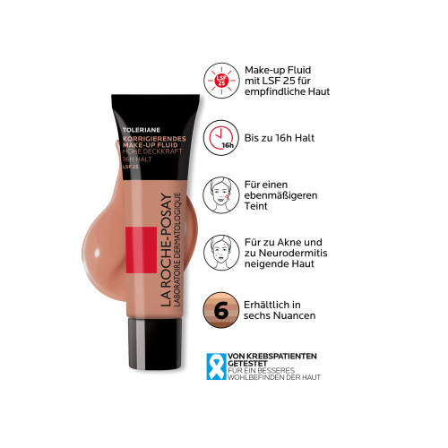 Das TOLERIANE Make-up Fluid von La Roche Posay ist ein korrigierendes Fluid, das Unebenheiten wie Pickel, Rötungen, Augenringe und Pickelmale bei unreiner Haut abdeckt. Die beruhigende Formel mit Neurosensine und Thermalwasser ist auch bei empfindlicher und zu Allergien oder Rosazea neigender Haut sowie während oder nach einer Krebstherapie geeignet. Dank LSF 25 schützt das getönte Fluid vor UV-Strahlen und beugt der Entstehung von Pigmentflecken vor. Die leichte, nicht fettende Textur mit feuchtigkeitsspendendem Glycerin besitzt eine ultrahohe Deckkraft, ohne maskenhaft auszusehen. Für einen ebenmäßigen Teint, der bis zu 16 Stunden hält. Ohne Duftstoffe.