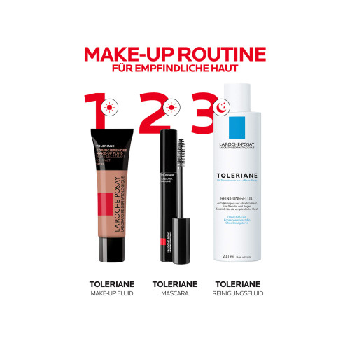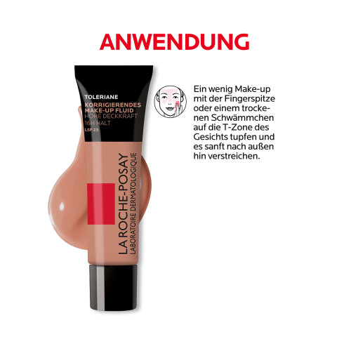 Als letzten Schritt der Pflegeroutine am Morgen eine kleine Menge des TOLERIANE Make-up Fluids mit den Fingerspitzen, einem Beauty-Schwämmchen oder einem Foundation-Pinsel von der Gesichtsmitte nach außen hin auftragen und die Übergänge sorgfältig verblenden. Stärkere Unebenheiten wie Augenringe oder Pigmentflecken können bei Bedarf mehrmals abgedeckt werden. Dabei ebenfalls darauf achten, dass keine auffälligen Übergänge entstehen. Bei Rötungen und Rosacea kann das Make-up mit der ROSALIAC AR Intensivpflege, bei Unreinheiten und Pickelmalen mit dem EFFACLAR Hochkonzentrierten Serum und bei Hautnebenwirkungen während und nach einer Krebstherapie mit dem CICAPLAST Baume B5+ kombiniert werden.