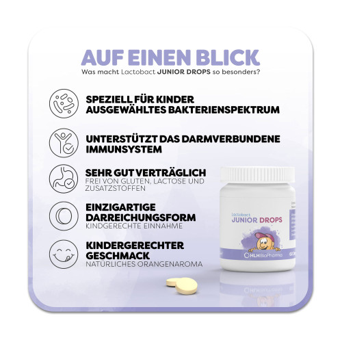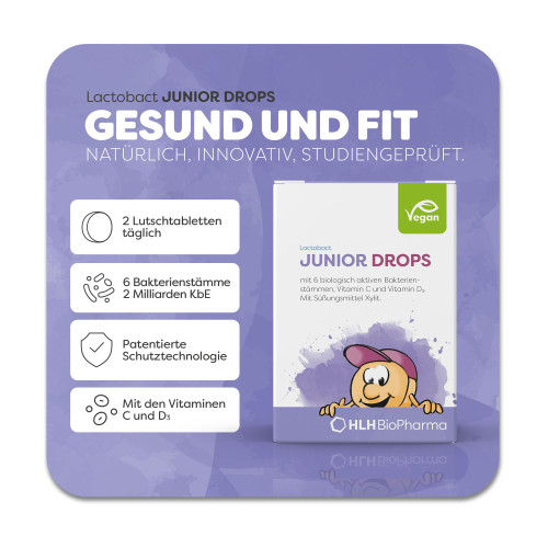Lactobact JUNIOR DROPS ist eine einzigartige Lutschtablette, in kindgerechter Darreichungsform. Das Produkt ist geeignet für Kinder ab 3 Jahren. Das Präparat enthält die gleichen 6 mikroverkapselten Bakterienstämme wie Lactobact JUNIOR+ und zusätzlich Vitamin C und Vitamin D3 . Lactobact JUNIOR DROPS unterstützt die natürliche Darmmikrobiota (Darmflora), z.B. bei der Abwehr unerwünschter Keime. Das Produkt kann einen positiven Einfluss auf die allgemeine Verträglichkeit von Nahrungsmitteln haben. Auch bei Antibiotikatherapien kann Lactobact JUNIOR DROPS unterstützend eingesetzt werden.