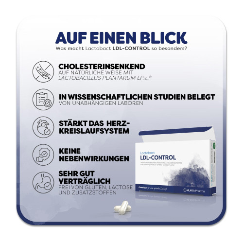 Bei Lactobact LDL-CONTROL handelt es sich um eine ergänzend bilanzierte Diät. Das Produkt nur unter ärztlicher Aufsicht einnehmen.