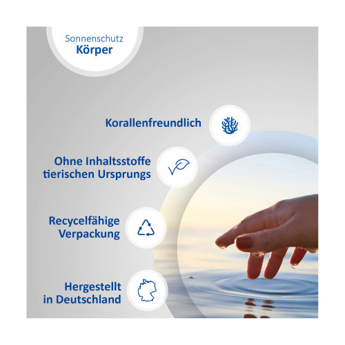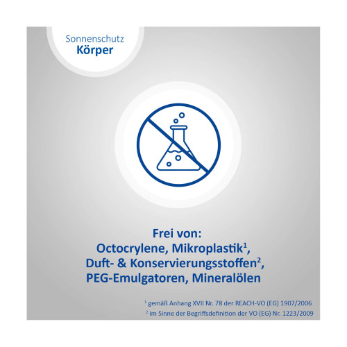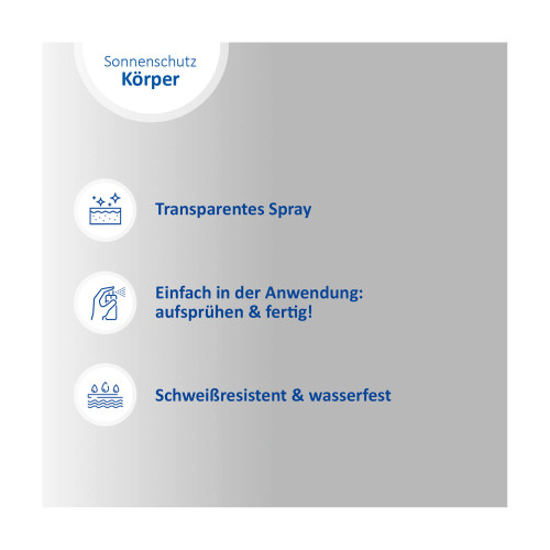 Um den Schutz aufrechtzuerhalten, alle zwei Stunden sowie nach dem Baden und Schwitzen nachsprühen. Zu wenig Sonnenschutzmittel verringert den Lichtschutzfaktor.