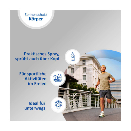 Tragen Sie das Sonnenschutz-Spray vor dem Sport großzügig auf Ihren ganzen Körper auf. Achten Sie besonders auf Nase, Lippen, Ohren, Schultern, Dekolleté, Fußrücken und unbehaarte Kopfhaut.