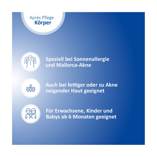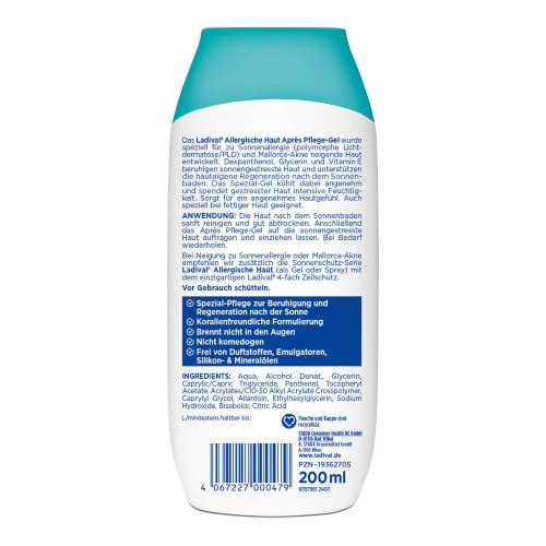 Nach dem Sonnenbaden ist es wichtig, die sonnengestresste Haut optimal zu pflegen und ihre Feuchtigkeitsspeicher aufzufüllen. Um Menschen mit allergischer Haut optimal zu versorgen, bietet Ladival® die Allergische Haut-Serie an. Diese wurde speziell für Haut entwickelt, die zu Sonnenallergie (polymorphe Lichtdermatose/PLD) und Mallorca-Akne neigt. Das Gel beruhigt die durch Sonneneinstrahlung beanspruchte Haut und pflegt sie intensiv.