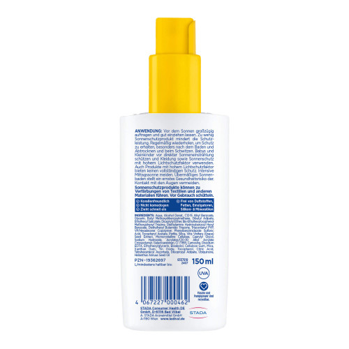 Um den Schutz aufrechtzuerhalten, alle zwei Stunden sowie nach dem Baden und Schwitzen nachcremen. Zu wenig Sonnenschutzmittel verringert den Lichtschutzfaktor.