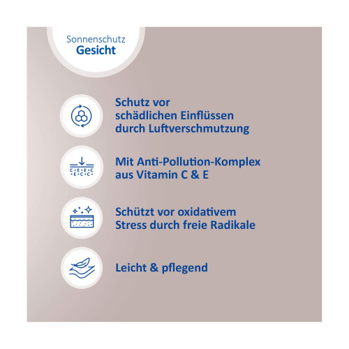 Ganzjähriger Sonnenschutz ist essenziell, da er nicht nur vor Sonnenbrand und sonnenbedingter Hautalterung schützt, sondern auch das Risiko an Hautkrebs zu erkranken reduziert. Um Ihrer empfindlichen Gesichtshaut das ganze Jahr über zusätzlichen Schutz vor schädlichen Einflüssen durch Luftverschmutzung zu bieten, hat Ladival die Antioxidativ Sonnenschutz-Creme mit Anti-Pollution-Komplex entwickelt. Die Creme enthält Antioxidantien, welche die Zellen vor oxidativem Stress durch freie Radikale schützen.
