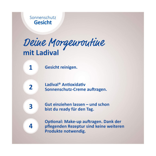 Sonnenstrahlen gibt es in verschiedenen Wellenlängen. Sie haben verschiedene Auswirkungen auf die Haut, wirken jedoch alle zellschädigend. Daher ist es wichtig einen Sonnenschutz zu verwenden, der rundum schützt. Dank 4-fach Zellschutz schützt die Ladival® Antioxidativ Sonnenschutz-Creme vor UV-A- und UV-B-Strahlen. Zusätzlich schützt es vor den Folgen der Infrarot-A-Strahlung und Teilen des sichtbaren Lichts (inkl. Blue-Light Schutz), um auch einer vorzeitigen, sonnenbedingten Hautalterung vorzubeugen.