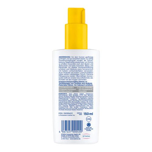 Um den Schutz aufrechtzuerhalten, alle zwei Stunden sowie nach dem Baden und Schwitzen nachcremen. Zu wenig Sonnenschutzmittel verringert den Lichtschutzfaktor.