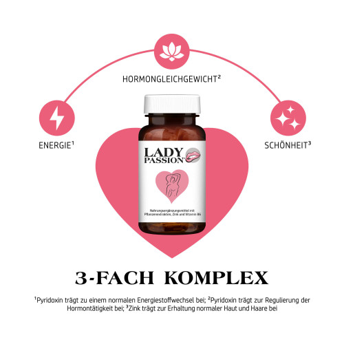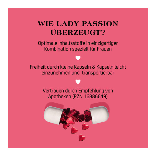 Lady Passion® ist ein hochwertiges Nahrungsergänzungsmittel mit einer optimalen Wirkstoffkombination speziell für Frauen. Lady Passion® beruht auf der Erkenntnis, dass für das Lustgefühl das Wohlergehen des gesamten Körpers und das Hormongleichgewicht eine Rolle spielt. Ein Ungleichgewicht der Hormone, verursacht durch Stress oder andere Faktoren kann einen negativen Einfluss auf die Lust und das sexuelle Verlangen haben. Hier setzt Lady Passion an: