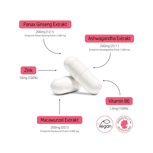 - Kombination von altbewährten Pflanzenextrakten aus drei Kulturen der Welt: Maca aus Peru, Panax Ginseng aus dem traditionellen China und Ashwagandha aus dem indischen Ayurveda