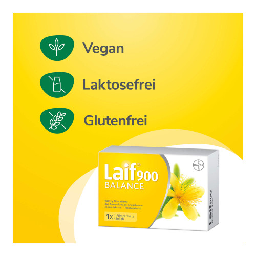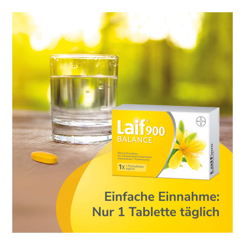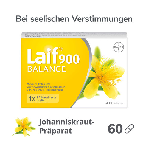 Laif 900 Balance. Wirkstoff: Johanniskraut-Trockenextrakt. Anwendungsgebiete: Zur Behandlung leichter depressiver Episoden (Störungen).