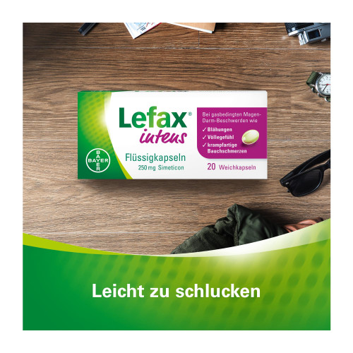 Wie sind Lefax® intens Flüssigkapseln einzunehmen? Lefax® intens Flüssigkapseln sind zu oder nach den Mahlzeiten, bei Bedarf auch vor dem Schlafengehen einzunehmen. Die Weichkapseln werden unzerkaut mit genügend Flüssigkeit (z.B. 1 Glas Wasser) geschluckt.