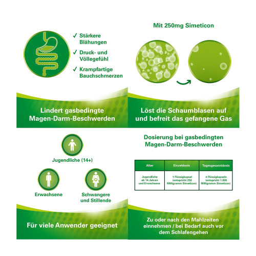 | Erwachsene und Jugendliche ab 14 Jahren | e und Jugendliche ab 14 Jahren 1 –2 Weichkapseln (entsprechend 250 mg bis 500 mg Simeticon) | 1 Weichkapsel (entsprechend 250 mg Simeticon) |