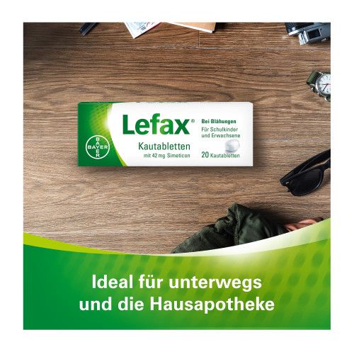 Lefax® 42 mg Kautabletten. Wirkstoff: Simeticon. Anwendungsgebiet: Übermäßige Gasbildung und Gasansammlungen im Magen-Darm-Bereich, Funktionelle Beschwerden im Magen-Darm-Bereich, wie Völlegefühl, vorzeitiges Sättigungsgefühl, Blähungen, Aufstoßen, Meteorismus (Darmkollem, Abgang von Darmgasen); Verstärkte Gasbildung nach Operationen; Zur Vorbereitung diagnostischer Untersuchungen im Bauchbereich zur Reduzierung von Gasschatten (Sonographie, Röntgen). Warnhinweis: Enthält Sucrose und Glucose.