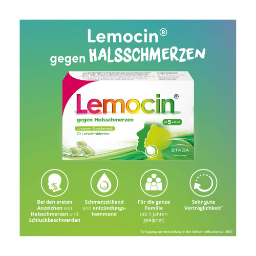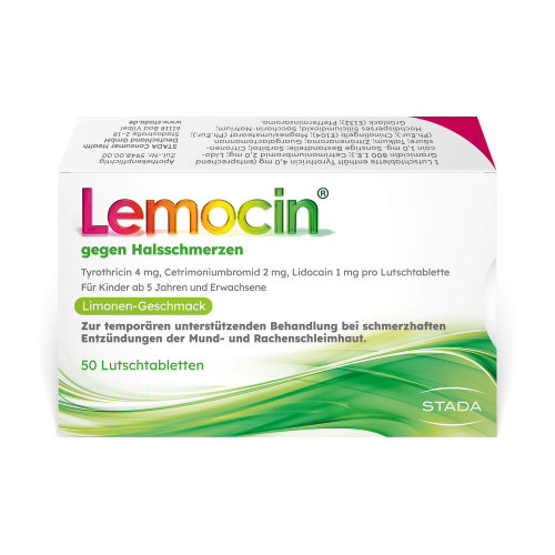 Lemocin gegen Halsschmerzen, Lutschtabletten. Wirkstoffe: Tyrothricin, Cetrimoniumbromid, Lidocain. Anwendungsgebiete: Zur temporären unterstützenden Behandlung bei schmerzhaften Entzündungen der Mund- und Rachenschleimhaut. Wenn Sie sich nach 2 Tagen nicht besser oder gar schlechter fühlen, wenden Sie sich an Ihren Arzt. Für Kinder ab 5 Jahren und Erwachsene. Warnhinweis:Enthält Sorbitol und Pfefferminzaroma.