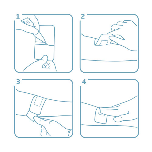 2. Applizieren Sie die Fläche mit dem Silikonauftrag auf der Haut, sodass die Wundauflage auf der Wunde platziert ist.