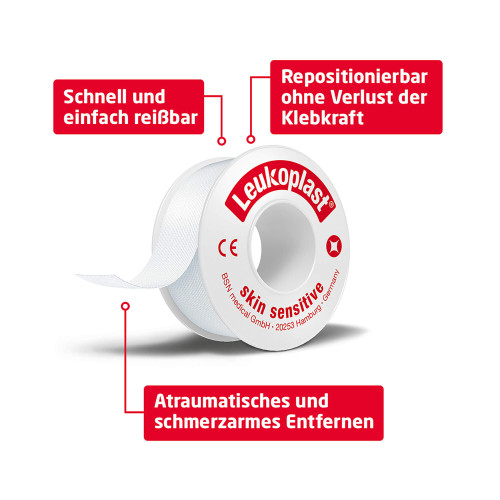 Leukoplast skin sensitive ist ein repositionierbares, atmungsaktives medizinisches Rollenpflaster zur Befestigung von Wundverbänden auf geschädigter oder empfindlicher Haut. Für Menschen mit sehr empfindlicher Haut ist die Leukoplast Skin Sensitive Technologie besonders geeignet, da der Silikonauftrag besonders schonend ist.