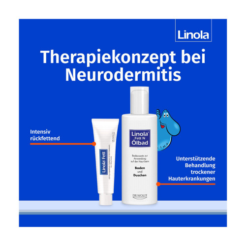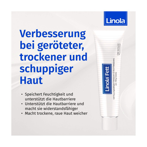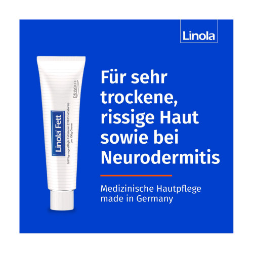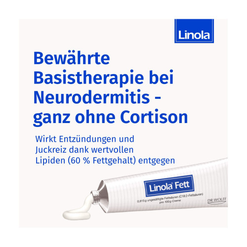 Linola® Fett, Creme. Wirkstoff: Ungesättigte Fettsäuren. Anwendungsgebiete: Zur unterstützenden Anwendung bei leichten bis mittelschweren Formen des atopischen Ekzems (Neurodermitis) im subakuten bis chronischen Stadium. Warnhinweis: Enthält Wollwachs, Cetylstearylalkohol und Butylhydroxytoluol.