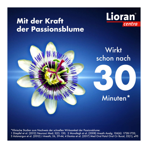 Lioran® centra. Wirkstoff: Passionsblumenkraut-Trockenextrakt. Anwendungsgebiete: Traditionelles pflanzliches Arzneimittel zur Besserung des Befindens bei nervlicher Belastung und zur Förderung des Schlafes ausschließlich auf Grund langjähriger Anwendung. Warnhinweise: Enthält Sucrose und Glucose.