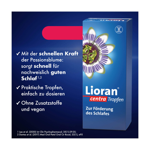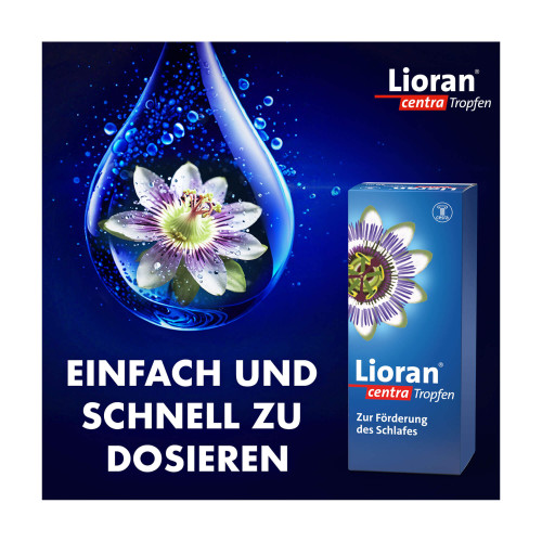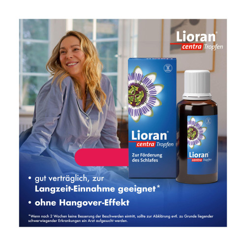 Lioran centra Tropfen. Wirkstoff: Passionsblumenkraut- Fluidextrakt. Anwendungsgebiete: Traditionelles pflanzliches Arzneimittel für Erwachsene zur Besserung des Befindens bei nervlicher Belastung und zur Förderung des Schlafes ausschließlich auf Grund langjähriger Anwendung. Warnhinweis: Enthält 1,2 g Alkohol (Ethanol) pro 2 ml.