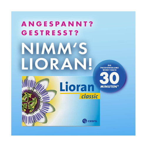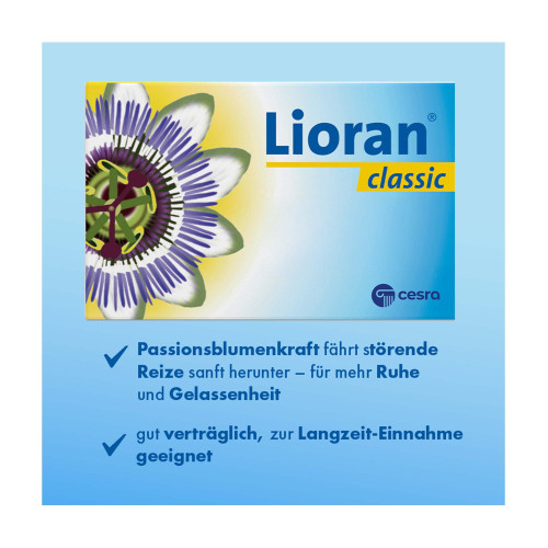 Lioran classic für Nacht und Tag die Passionsblume, Hartkapseln. Wirkstoff: Passionsblumenkraut-Trockenextrakt. Anwendungsgebiete: Traditionelles pflanzliches Arzneimittel zur Besserung des Befindens bei nervlicher Belastung und zur Unterstützung des Schlafes ausschließlich auf Grund langjähriger Anwendung. Warnhinweis: Enthält Lactose.