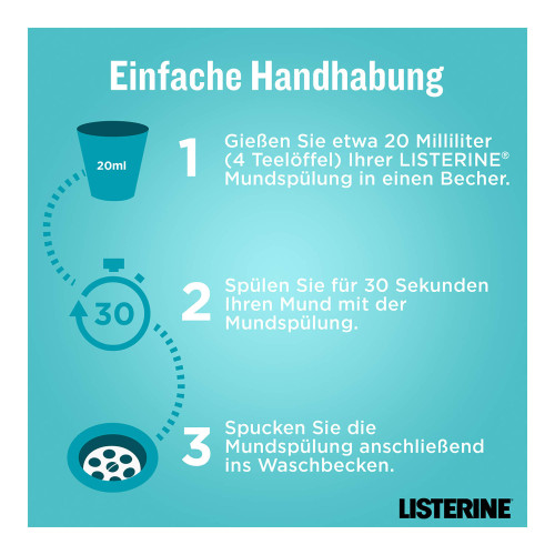 Für den besten Effekt morgens und abends täglich nach dem Zähneputzen spülen. Dazu 20 ml (ca. 4 Teelöffel) in ein Glas geben, ca. 30 Sekunden spülen und anschließend ausspucken. Für Kinder zwischen 6 und 12 Jahren 10 ml verwenden.