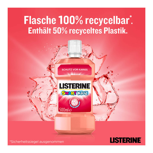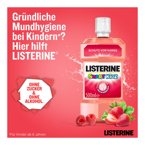 LISTERINE Smart Kidz Mild Berry ist eine Mundspülung für Kinder ab 6 Jahren, welche die Zähne Ihres Kindes vor Karies schützt, wenn sie 2x pro Tag nach dem Zähneputzen verwendet wird und macht da weiter, wo die Zahnbürste aufhört. Die Mundspülung für Kinder enthält Fluorid, das die Zähne stärkt und das Auftreten von Karies bis zu 40% mehr reduziert als Zähneputzen alleine. Zudem bekämpft die Mundspülung für Kinder schädliche Bakterien, eine Hauptursache für Plaque und Zahnfleischirritationen. Sie reinigt im gesamten Mundraum, erreicht die Zähne, das Zahnfleisch und die Zunge. Die Mundspülung zieht Speisereste an und färbt diese ein, so sieht ihr Kind diese beim Ausspucken im Waschbecken. Ohne Alkohol und ohne Zucker.