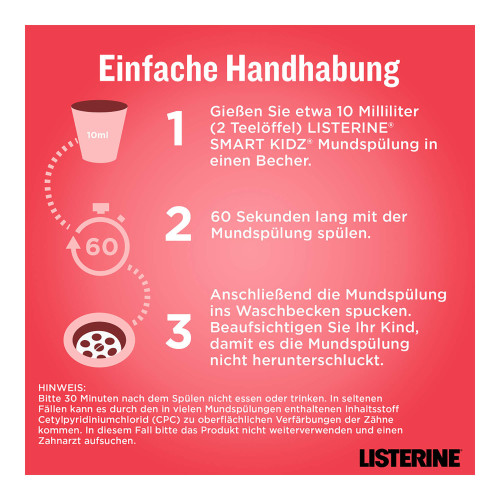 Zweimal am Tag nach dem Zähneputzen verwenden. Geben Sie dazu 10 ml (ca. 2 Teelöffel) LISTERINE® SMART KIDZ® in ein Glas, 60 Sek. Lang spülen, dann ausspucken. Beaufsichtigen Sie ihr Kind, damit es die Mundspülung nicht herunterschluckt.