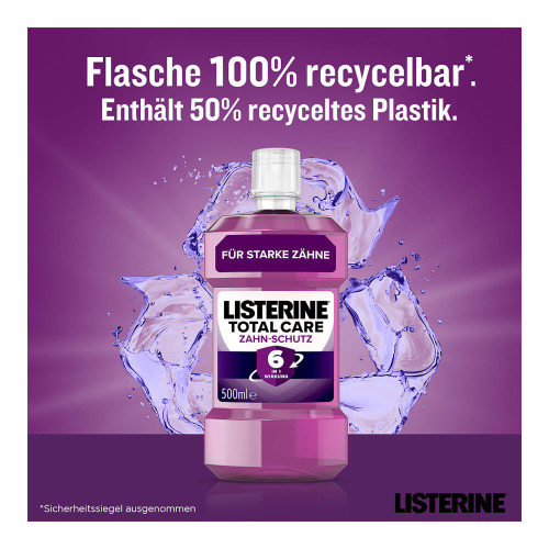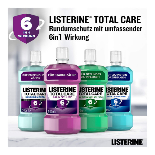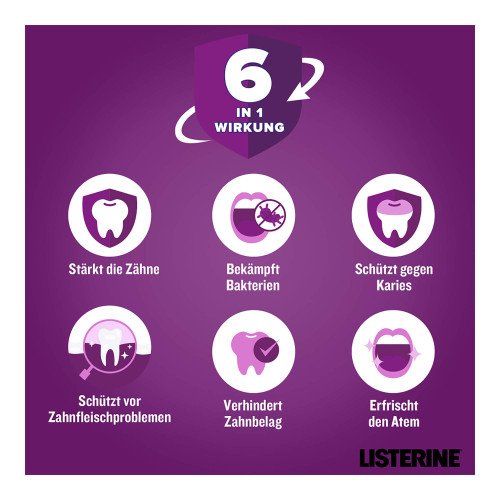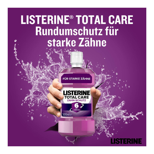 Zweimal am Tag angewendet, verbessert LISTERINE Total Care Zahn-Schutz die Mundhygiene – mit ätherischen Ölen, Fluorid und Zinkformel. Die antibakterielle Mundspülung bekämpft Bakterien auch dort, wo die Zahnbürste nicht hinkommt: zwischen den Zähnen, am Zahnfleisch und auf der Zunge. Die Mundspülung bietet Rundumschutz für starke Zähne mit 6 in 1 Wirkung und erfrischt den Atem bis zu 24 Stunden. Zudem schützt sie vor Karies, stärkt die Zähne durch Fluorid und reduziert Zahnbelag.