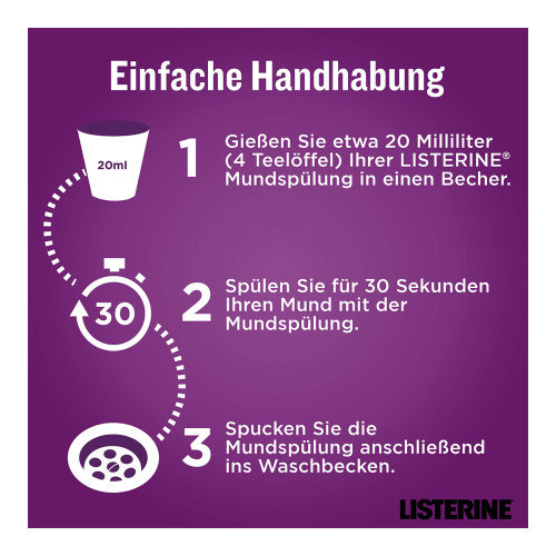 Für den besten Effekt morgens und abends täglich nach dem Zähneputzen spülen. Dazu 20 ml (ca. 4 Teelöffel) in ein Glas geben, ca. 30 Sekunden spülen und anschließend ausspucken.